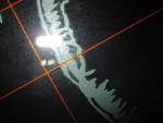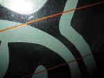 6. und 7. Der Aufkleber in Nahaufnahme, damit man die Ränder erkennen kann, und sieht, daß sie sauber und nicht wackelig oder zittrig sind. Die orangen Linien sind die Heckscheibenheizung...als Größenvergleich gut geeignet.